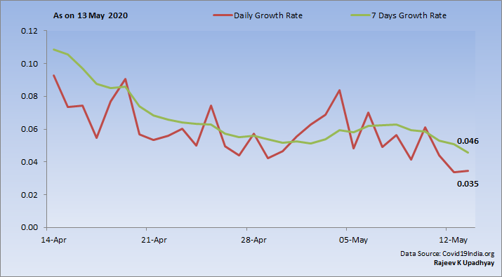 A few observations from 8th May 2020 National Data on the Coronavirus pandemic:-1. New cases are increasing everyday. However the daily growth rate has fallen down to 3.5%. The daily growth rate is going down but on an average everyday more than 3500 new cases are increasing. This clearly indicates the long drawn battle against coronavirus.