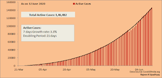 1. COVID19 new case count increased by 11,314 on 12th June 2020. The 3-days average has increased to 11,201. The 7 days and 14 days averages increased to 10,500 and 9,722 new case counts respectively. These moving averages must start falling to reverse the trend which looks a distant dream till the third week of July 2020. From the district level data, it is evident that coronavirus has reached the rural districts which were almost unaffected but slowly, numbers of positive as well as active cases in these rural districts are falling sharply. In specific areas of Delhi, Mumbai and Chennai, community transmission has become an unfortunate reality. States can control the spread with strict policies in these hotspots. Whatever economic cost lockdown may have but locking down these hotspots strictly is the only way to stop the community transmission of the corona as well as to break the chain. From the data, it seems that the daily case counts would increase to 15,000 in the next two weeks. But at the same time it is also expected once daily count increases to 15,000 mark, the peak of the corona curve will be reached and the growth in daily count will stagnate. From there a downward trend is expected. But the daily count of 15,000 will sustain for many weeks.