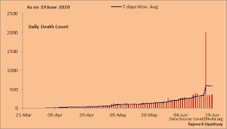 A few observations from 19th June 2020 (National Data) on coronavirus pandemic:-1. COVID19 new case count increased by more than 6.6% to 14,740 on 19th June 2020 with 7-days and 14-days averages of 12,319 and 11,409 respectively. A conclusive change in the reversal of the trend before the 3rd week of July 2020 looks distant. The coronavirus has reached the unaffected rural districts but the numbers of positive are active cases in these rural districts are falling sharply. In specific areas of Delhi, Mumbai and Chennai, community transmission is an unfortunate reality now. States can control the spread with strict lockdown in the hotspots irrespective of the economic costs to stop the community transmission and break the chain. The daily case counts are expected to hit the peak of 15,000 soon to stagnate for some time and then to fall.